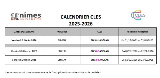 Le CLES (Certificat de Compétences en Langues de l’Enseignement Supérieur) est une certification accréditée par le Ministère de l’Education Nationale et adossée au Cadre Européen Commun de Référence pour les Langues (CECRL), qui permet d’évaluer les compétences opérationnelles de communication des étudiants en plusieurs langues.Le CLES évalue de façon directe 5 compétences : la compréhension de l'oral, la compréhension de l'écrit, la production écrite, la production orale et l'interaction orale.