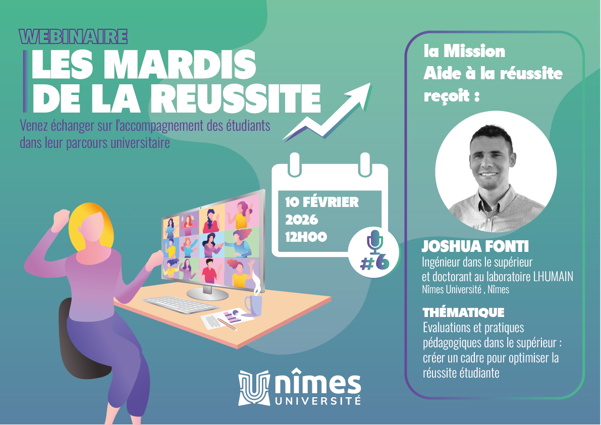 Le sixième webinaire mensuel des Mardis de la réussite reçoit le 10 février 2026 à 12h Joshua FONTI Ingénieur pédagogique à Nîmes Université et doctorant au laboratoire LHUMAIN pour des échanges sur les évaluations et pratiques pédagogiques dans le supérieur : créer un cadre pour optimiser la réussite étudiante.