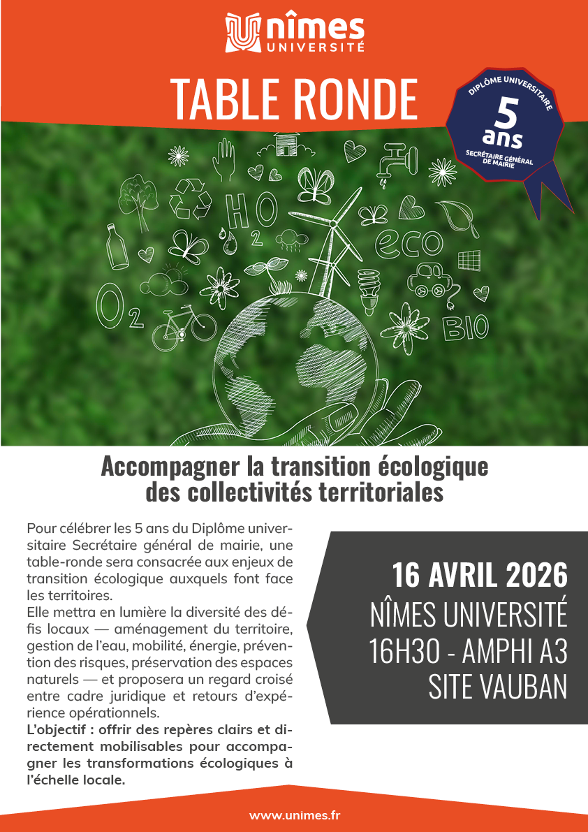 À l’occasion du 5ᵉ anniversaire du Diplôme universitaire “Secrétaire général de mairie” proposé par Nîmes Université, la cérémonie de remise des diplômes s’accompagnera d’une table ronde consacrée au défi de la transition écologique pour les collectivités territoriales le 16 avril 2026 à 16h30, organisée sur le site Vauban – Amphi A3.