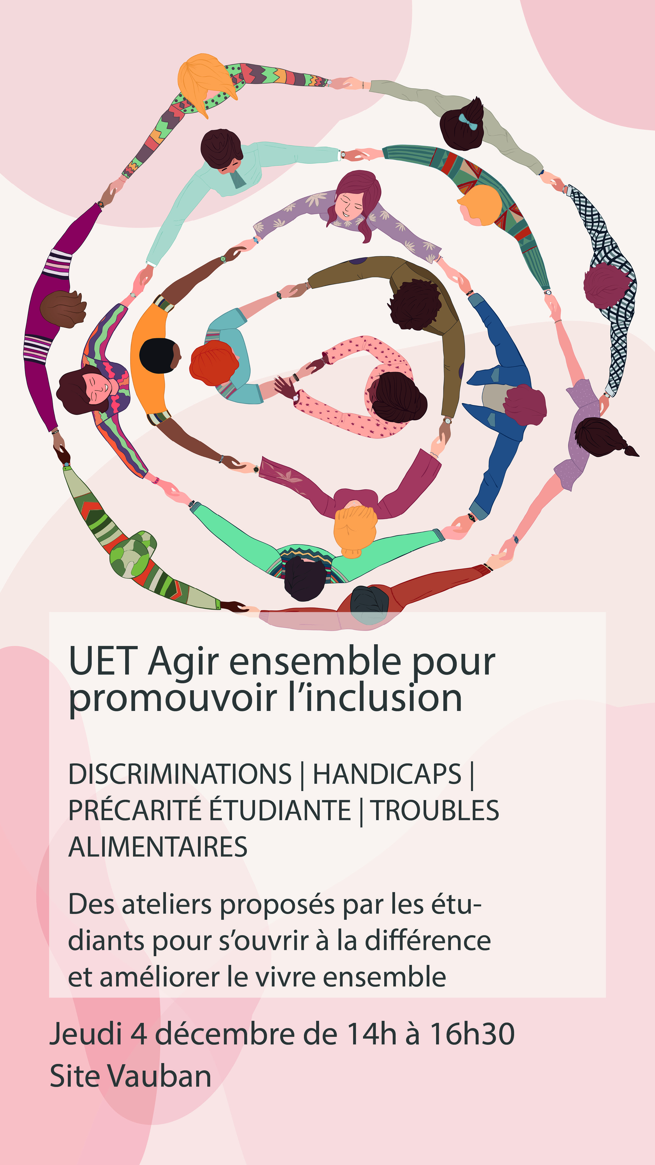 Comme chaque année, les étudiantes et étudiants de l’UET Promouvoir l’inclusion à l’université conduiront leurs ateliers de fin de semestre, ouvert à toutes et tous, le jeudi 4 décembre, de 14h à 16h30 sur le site Vauban.