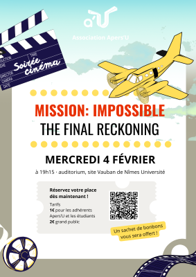 Retrouvez le film "Mission: impossible - The Final Reckoning" sur l'écran de l'auditorium le mercredi 5 février à 19h15 sur le site Vauban de l'université.