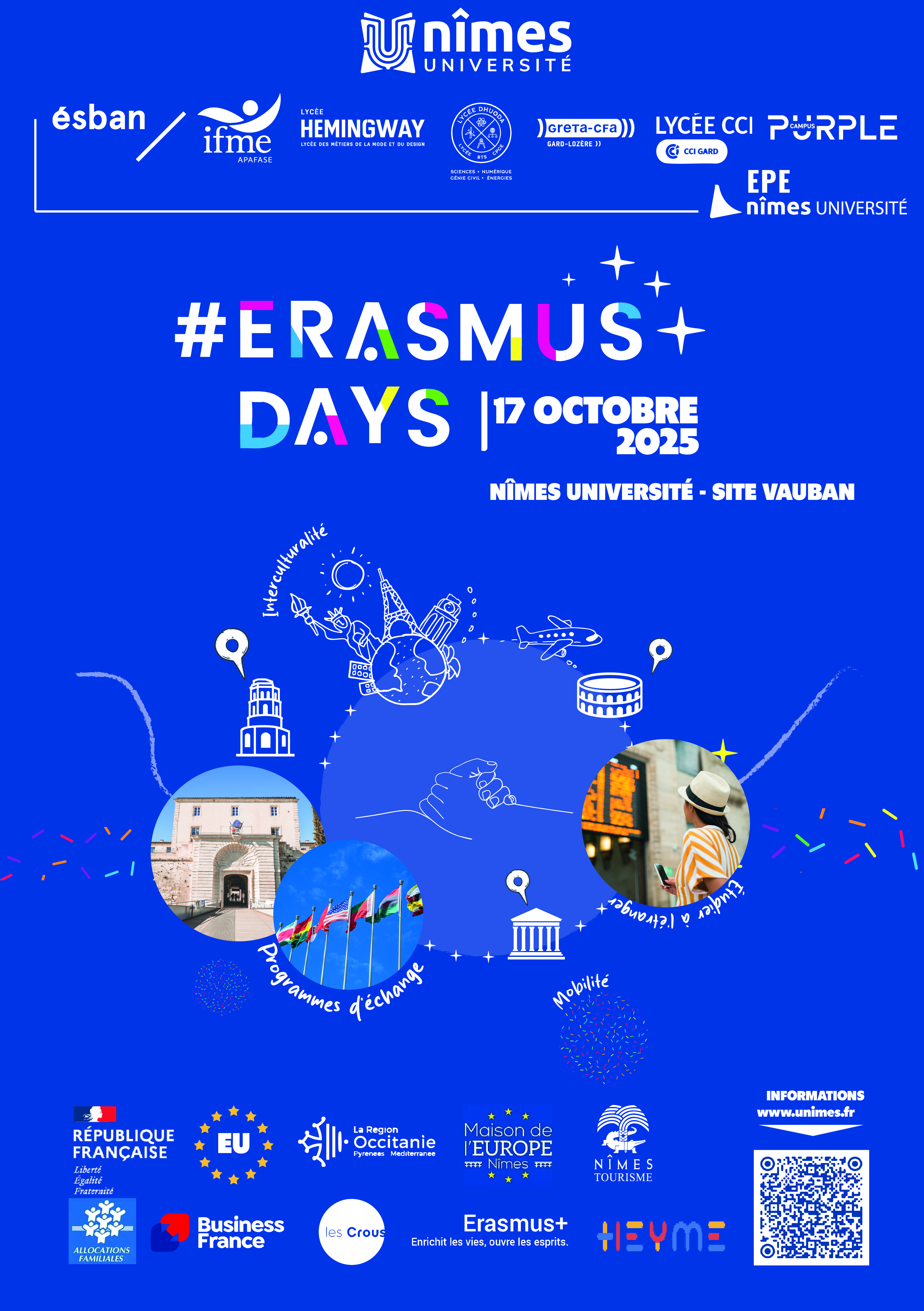 Le 17 octobre, les services relations internationales de l'EPE Nîmes Université se mobilisent pour faire vibrer l’Europe et mettre à l’honneur ses valeurs pendant une journée au sein du site Vauban de Nîmes Université. Les valeurs européennes, au cœur même de l’esprit des #ErasmusDays, rythmeront cette 9e édition qui aura pour accroche : « Vivre nos valeurs, dessiner notre avenir ».