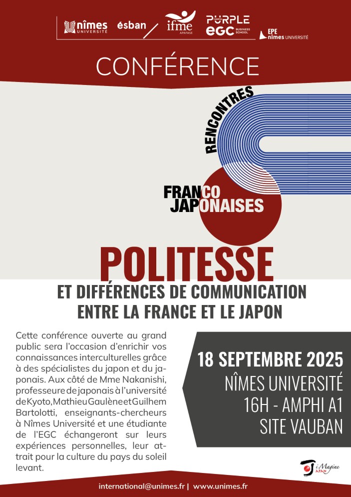 Cette conférence ouverte au grand public sera l’occasion d’enrichir vos connaissances interculturelles grâce à des spécialistes du japon et du japonais. Aux côté de Keiko Nakanishi, professeure de japonais à l’université de Kyoto, Mathieu Gaulène et Guilhem Bartolotti, enseignants-chercheurs à Nîmes Université et une étudiante de l’EGC échangeront sur leurs expériences personnelles, leur attrait pour la culture du pays du soleil levant.