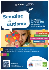 L’association Aspie-Family, implantée à Nîmes et rassemblant plus de 300 adhérents dans le Gard, tiendra un stand à Nîmes Université afin d’échanger avec les étudiants et les personnels autour des réalités de l’autisme. Composée de familles concernées et de professionnels (psychologues, éducateurs…), l’association œuvre au quotidien pour soutenir les personnes présentant un Trouble du spectre de l’autisme et leurs proches, en favorisant leur inclusion sociale, éducative et professionnelle. Ce temps de rencontre sera l’occasion de poser vos questions, de découvrir les actions de l’association et d’échanger autour des défis rencontrés par les personnes autistes et leurs familles, dans une atmosphère conviviale et ouverte à tous.