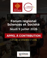 Save the date ! Le prochain Forum régional Sciences et Société aura lieu le jeudi 9 juillet 2026 sur le site Hoche de Nîmes Université. Cet événement est organisé par la Région Occitanie Pyrénées Méditerranée, le Consortium d’animation du réseau Science(s) en Occitanie et Nîmes Université, avec l'appui de son Comité stratégique. Cette rencontre professionnelle, axée cette année sur la thématique "Aller vers", est ouverte à toutes les personnes d'Occitanie investies dans le dialogue entre Sciences, Recherche et Société.