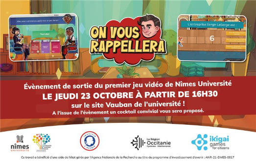 Dans le cadre du projet DEMOES Unanîmes, Nîmes Université présente jeudi 23 octobre 2025 à 16h30 sur son site Vauban son premier jeu vidéo pédagogique On Vous Rappellera disponible sur iOS.