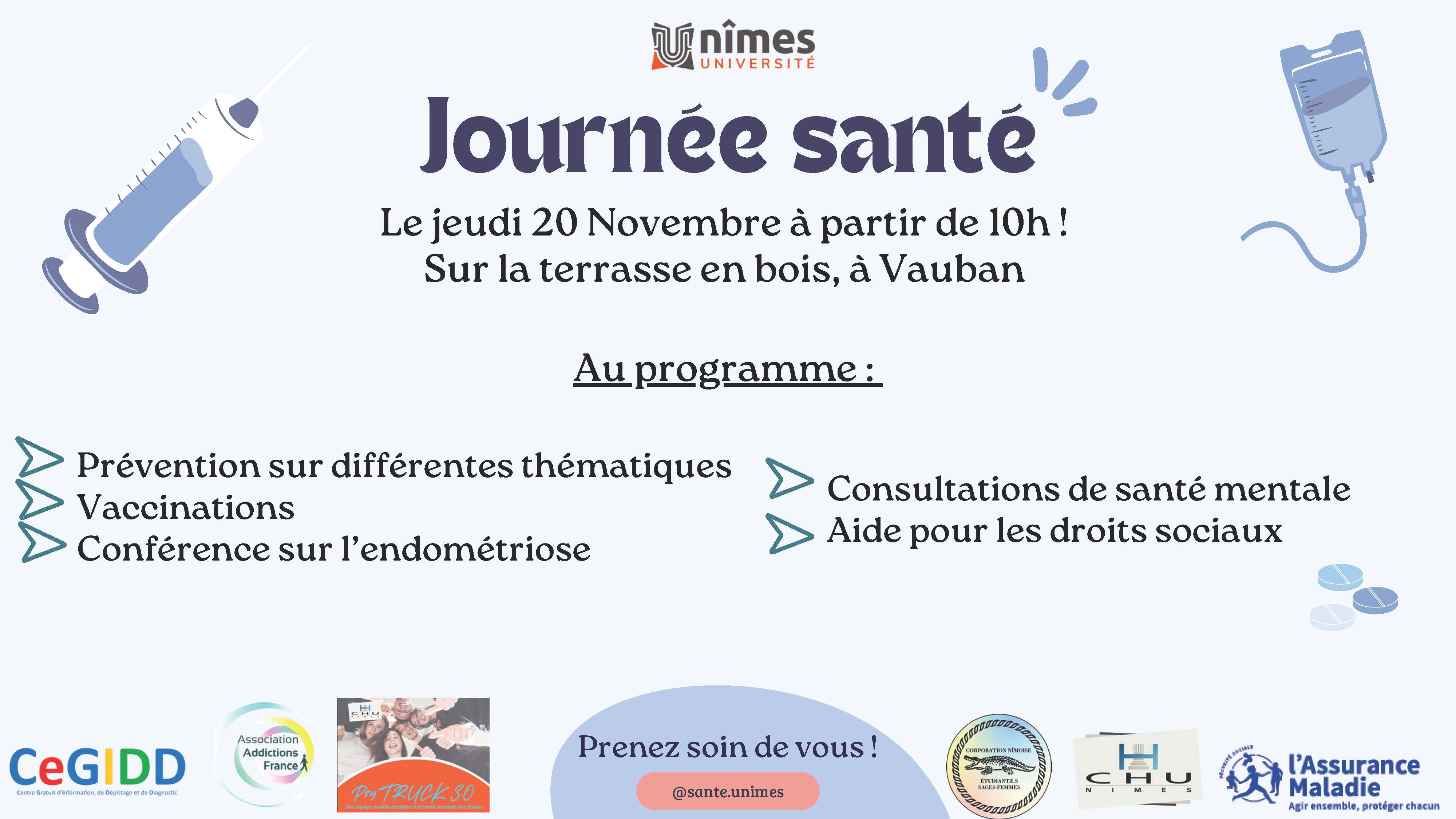 Le Centre de Santé Étudiante organise, en partenariat avec plusieurs acteurs de la santé, une journée dédiée à la prévention, à l’information et à l’accompagnement des étudiants et des personnels.